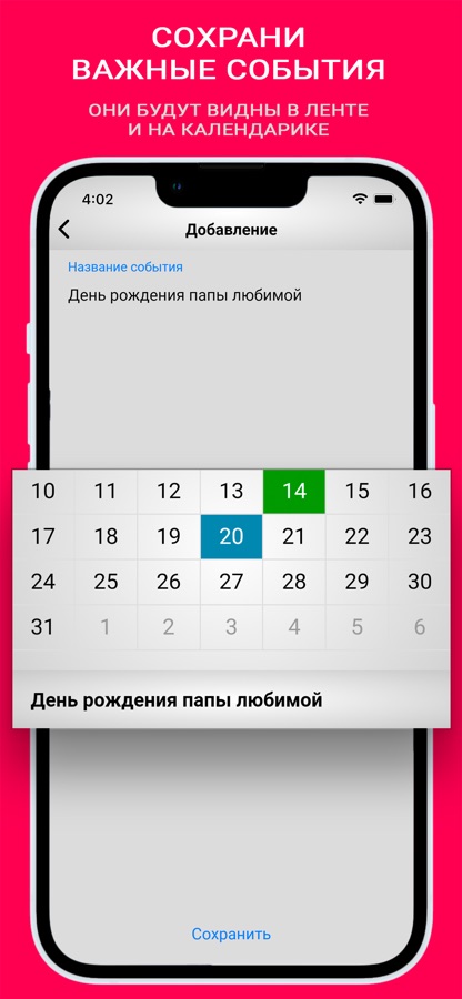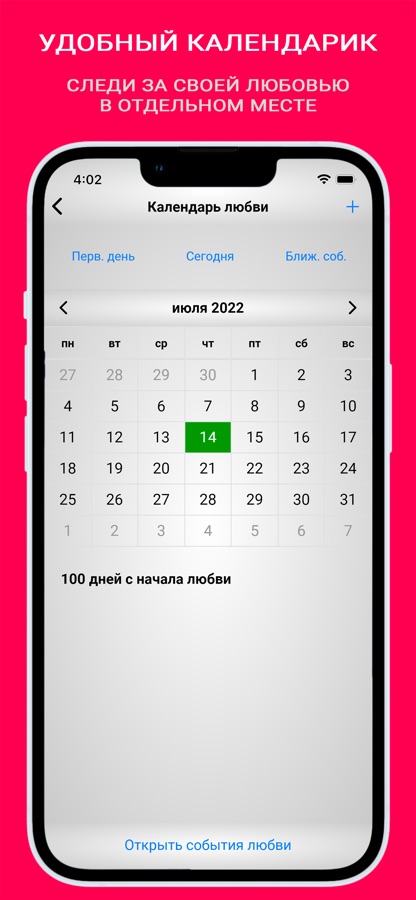 Календарь — это особое место на телефоне, в котором можно хранить только то, что связано с Вашей любовью (годовщина, юбилей). Всем известно, что очень важно иметь отдельное место для важной части жизни. Для каждого события автоматически задаются уведомления — за неделю, дважды накануне (в полдень и вечером в 9 часов), и в день важного события.