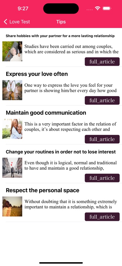 love test — бесплатное приложение, которое предлагает вам любовную викторину, чтобы узнать о совместимости с вашим партнером. В дополнение к этому тестеру любви вы также найдете другие тесты, такие как тест на дружбу и тест на ревность, а также полные статьи с советами о настоящей любви и отношениях.