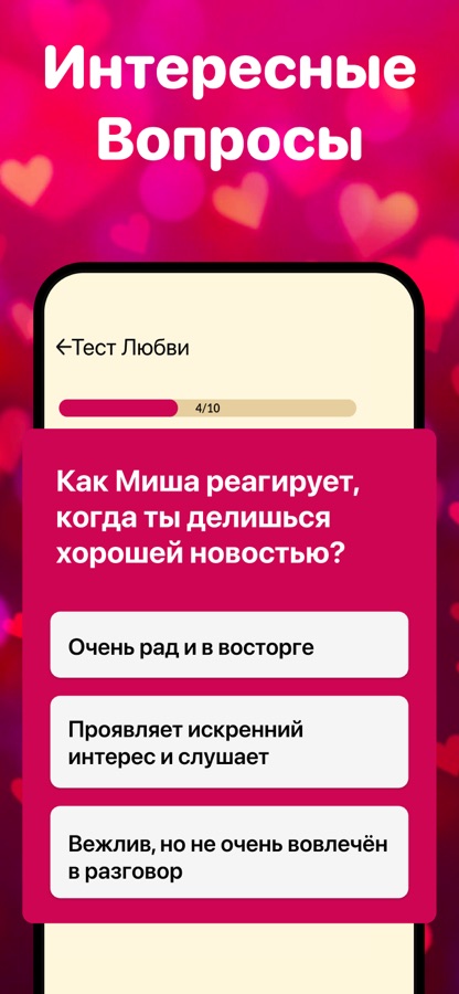 Вы можете проходить викторину столько раз, сколько захотите. Вы можете пройти тест на любовь, как и когда захотите. Приложение предлагает неограниченный доступ для всех пользователей. Это позволяет вам снова пройти любовную викторину даже для того же партнера. Мы постоянно работаем над добавлением контента и функций в наше приложение. Наша цель — сделать так, чтобы вам никогда не было скучно, даже если вы пройдете тест в десятый раз».