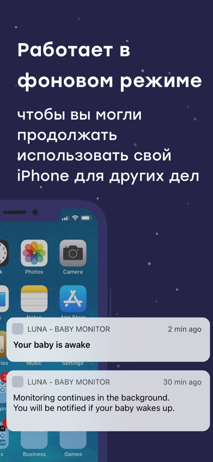 Luna — многозадачное приложение! В отличие от других приложений-радионянь, Luna работает в фоновом режиме надежно и без проблем. Это позволяет использовать мобильное устройство для других нужных вам задач.