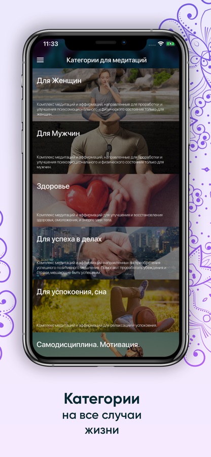 В приложении Вы найдете медитации и аффирмации в таких категориях: