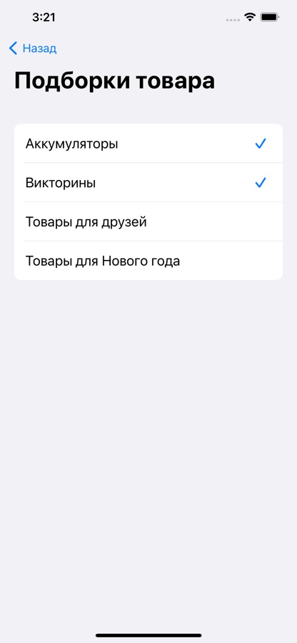 Товары сгруппированы по подборкам, кроме того, доступна возможность просмотреть весь список целиком.