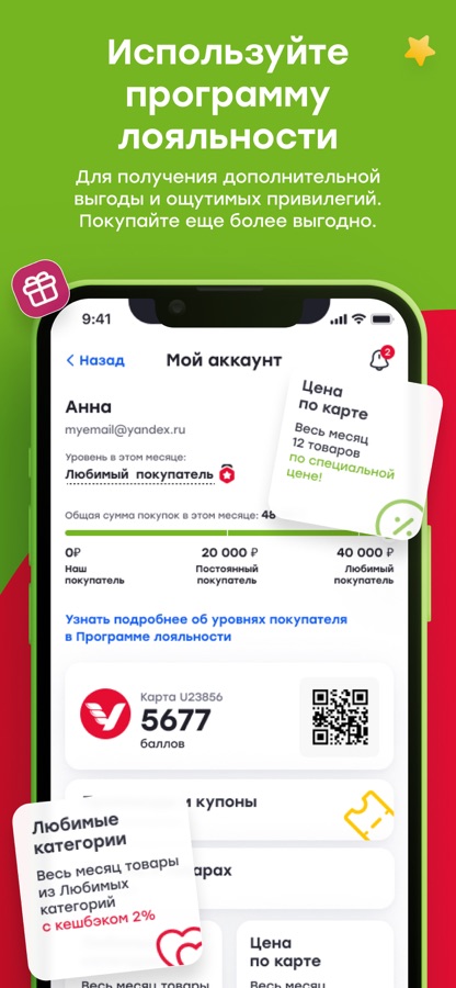 – копить кэшбек баллами (1 балл = 1₽) и оплачивать ими до 99% стоимости покупки в наших магазинах, кулинариях и доставке;