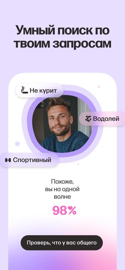 Если вы хотите разнообразить поиск, играйте в симпатии! Проведите по экрану вправо или влево и общайтесь в чате только с теми, с кем совпала пара.