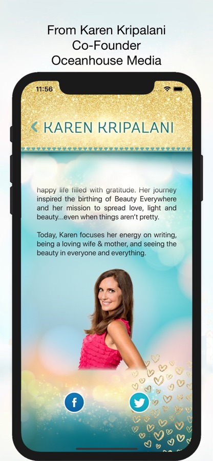 Karen Kripalani, along with her husband and soulmate Michel, co-founded Oceanhouse Media, a leading publisher of over 600 mobile apps that uplift, educate and inspire. She has been a student of conscious manifestation for over 20 years. When she set out to find her soulmate she called upon and created some powerful processes that helped to bring her Divine love to fruition. The self-love lessons contained in this app led her to meet her husband, with whom she experienced an instant soul connection.