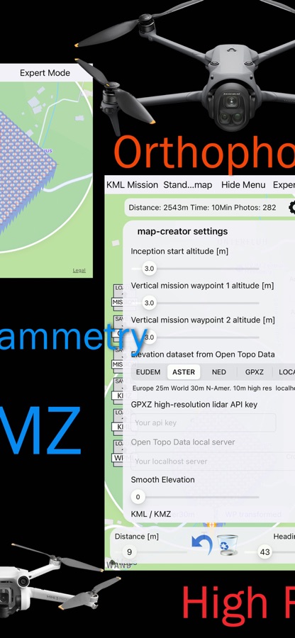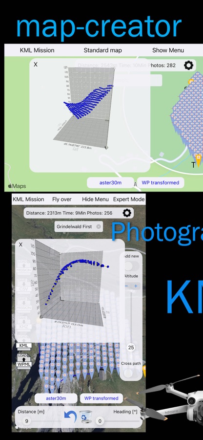 You can create and edit the mission waypoints on the map. Save and load your mission in the iCloud in CSV format.