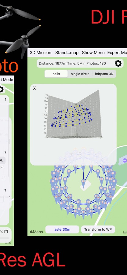 3. 3D spherical Mission, double helix (3D elevation support), adaptive pitch on altitude