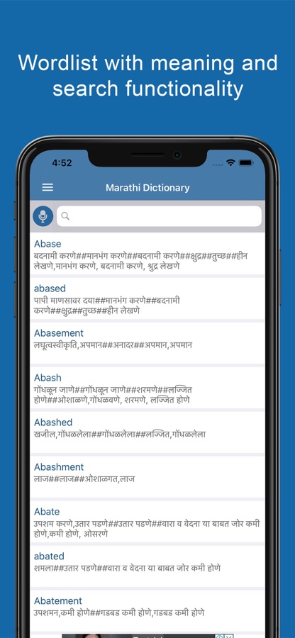 Our new English to Marathi Dictionary and Translator app is a light weight and elegant tool. You can find over 75,000+ english words with their Marathi meanings for Free on your smartphone! You can easily search for any word you want and we will take care of giving the meaning of it.