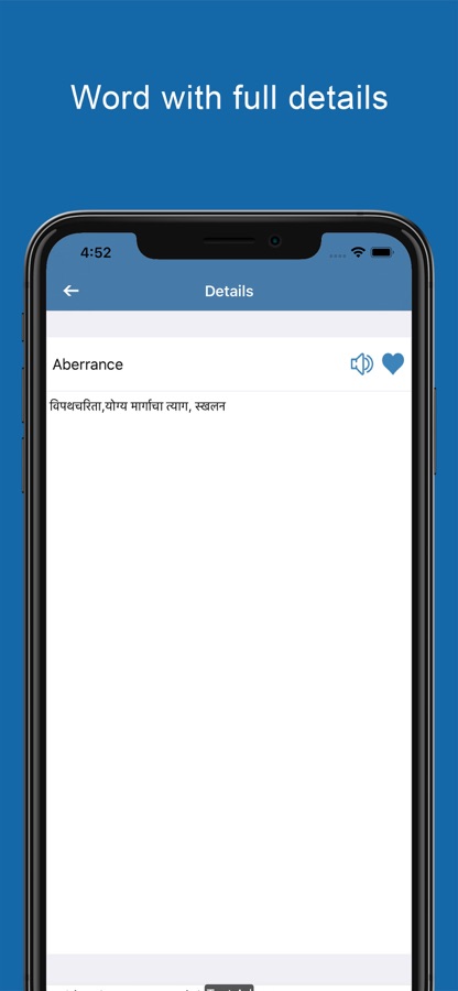 — Want to save a word meaning in the favourites? Tap the heart button and we will add this word automatically in your favourites. You can easily access to it anytime within the favourites choice in the options menu.
