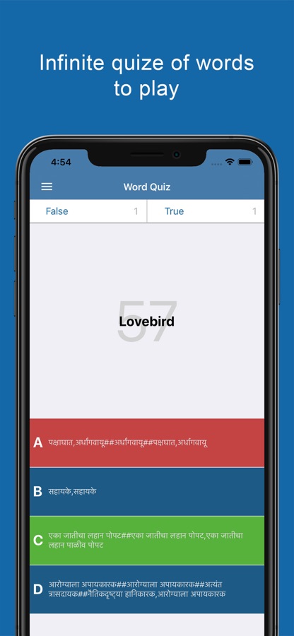 — We developed a new quiz inside Marathi dictionary! To take the quiz, you can easily tap the option icon in the top left side of the screen and choose quiz. Now, you will see a word in the screen with 4 answers, you will have to tap the answer that you think its right to see if it’s the good choice or not.