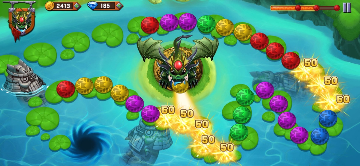 The basic rule for this game is quite easy, just aim to the target and shoot marbles from the dragon’s mouth, when three or more marbles with same color are linked together, they would disappear. And if you can eliminate all the marbles before the chain reaches to the end, you win!