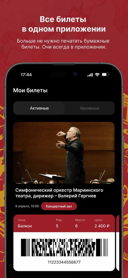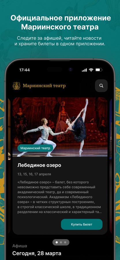 Новое официальное приложение Мариинского театра. Позволяет просматривать афишу и покупать билеты. Содержит информацию о составах исполнителей, краткие содержания, фотографии и историю создания спектаклей. Зарегистрированным зрителям театра даёт возможность удобной навигации по билетам и заказам. На этапе выбора мест можно увидеть обзор сцены. Приложение позволяет находиться в курсе новостей и специальных предложений театра.
