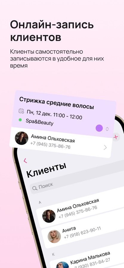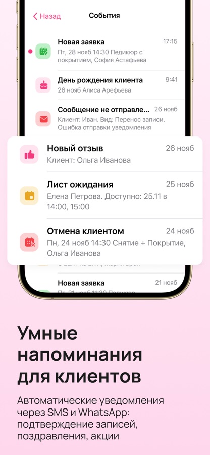 • автоуведомления и напоминания клиентам — снижайте количество отмен и неявок, используя автоматические напоминания о будущих визитах;