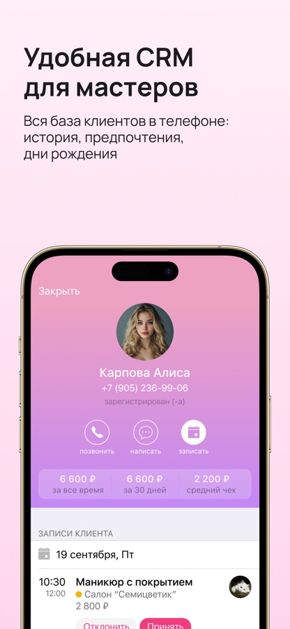 Мастерс — больше, чем просто онлайн-запись клиентов. Это ваш персональный ассистент! Полноценная crm (срм-система) мои клиенты, которая помогает экономить время и увеличивает прибыль.