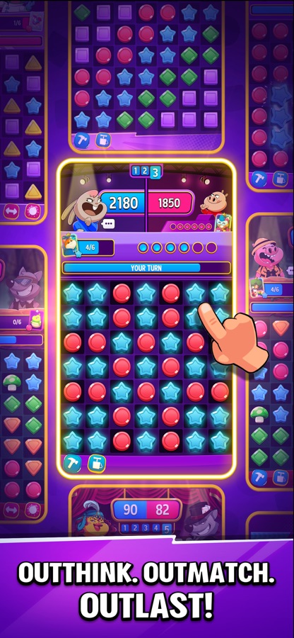 В Match Masters игроки по очереди играют на одной игровой доске, поэтому выбор, который они делают, влияет на других игроков. Каждый ход может изменить ход всей игры, и настоящие мастера игры Match Masters учитывают не только счет хода, но и возможности, которые он создаст для их противника!