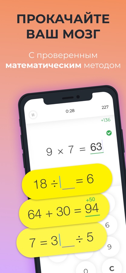‘Math Brain Booster’ содержит в себе разные режимы тренировок, каждый из которых состоит из множества простых математических задач. От вас требуется сконцентрироваться и решить как можно больше задач за ограниченное время. Со временем у вас будет получаться все лучше и лучше и вы заметите РОСТ производительности вашего мозга.