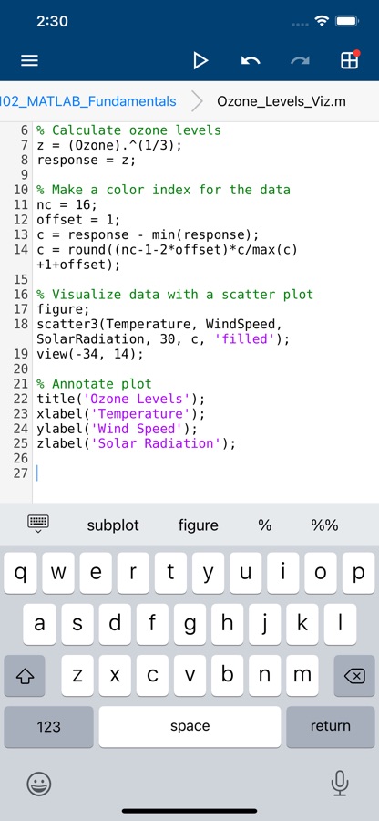 Evaluate MATLAB commands, create and edit files, view results, acquire data from sensors, and visualize data – from the convenience of your mobile device.