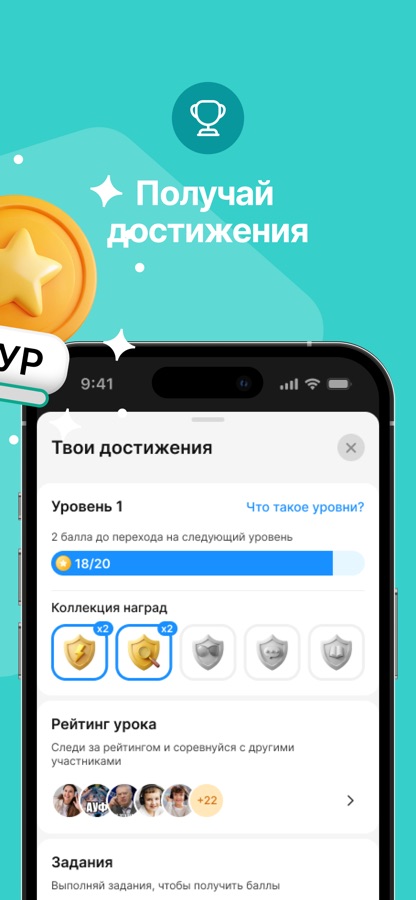 — Занимайтесь с интересом. Получайте баллы за активность на уроке, достигайте новых уровней, коллекционируйте награды и соревнуйтесь в рейтинге урока, ведь это делает процесс обучения не только эффективнее, но и веселее.