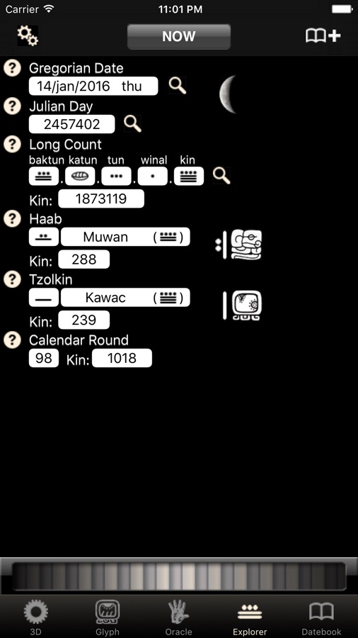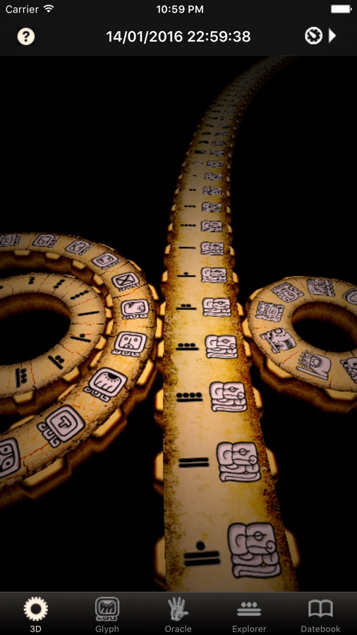 The full beauty of the Ancient Maya Calendar can be seen on the interactive 3D clock. Each different cycle is a gear in the clock. You can touch a gear and drag all the others forward and backward in time, and the figures at the the point where the gears intersect displays each cycle’s current day.