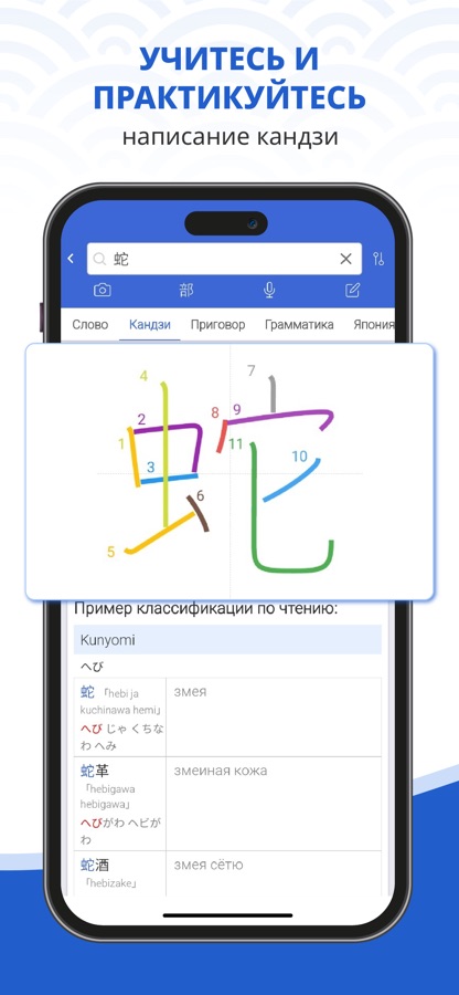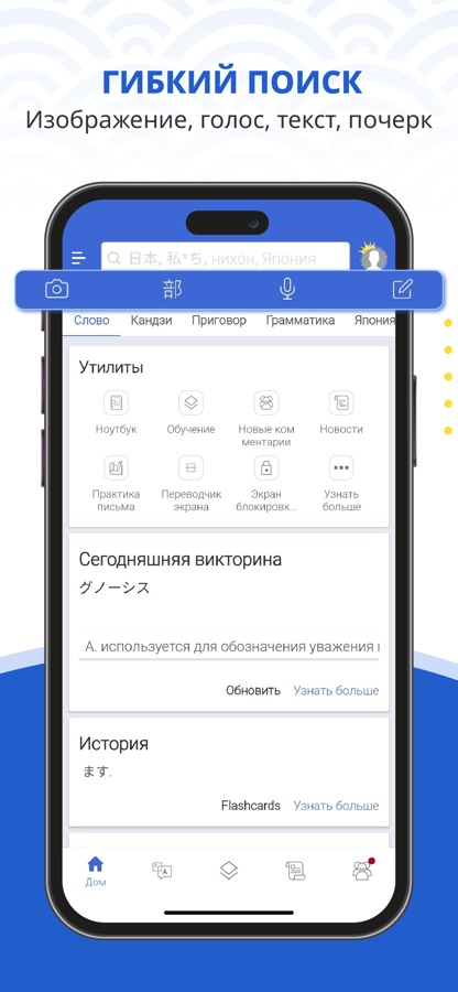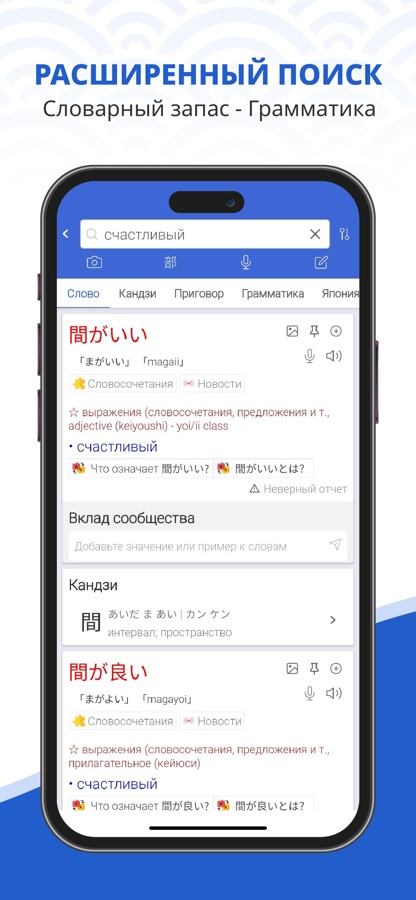 — Поиск лексики, иероглифов, структур предложений, грамматики и особенностей японского языка, родного языка, ромадзи и хираганы с подробными объяснениями и примерами.