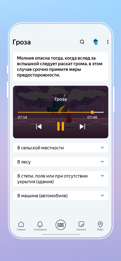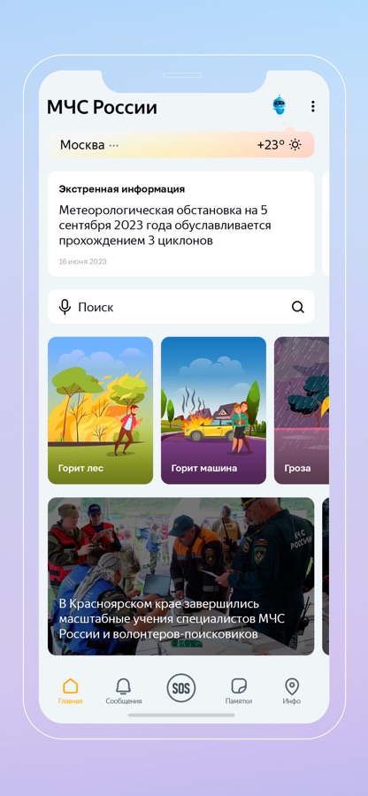 Приложение позволяет подготовиться к различным чрезвычайным ситуациям, получать актуальную информацию о возможных угрозах и рисках.