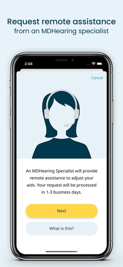 • Request remote assistance and an MDHearing specialist will remotely fine-tune your settings through the app