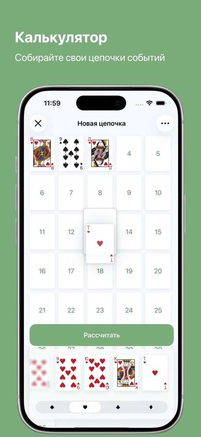 Создавайте эффективные цепочки на основе заданных карт. Вы можете выбрать количество шагов, которое хотите пройти, размер колоды — 36, 48, 52, 60 или 64 карты, и множество различных фильтров. Также возможно использование карт Таро (Уэйта или Тота).