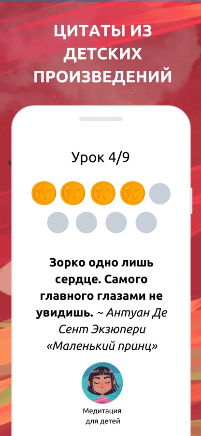 Это приложение создавалось для того, чтобы медитацией по возможности мог заниматься каждый ребенок. Поэтому уроки в нем купить нельзя. Каждый последующий урок можно лишь “заработать” прохождением любого из предыдущих. Как только ребенок прошел урок, он получает медаль за занятие, и открывается урок следующий (пока все уроки не будут открыты; после чего можно заниматься по любому из уроков уже без набора медалей).