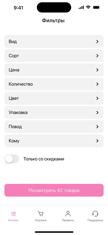 При необходимости можно выбрать при помощи фильтра товары по стоимости, задать условия для поиска цветов и праздничных атрибутов.