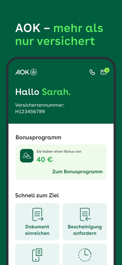 Ihre Krankenkasse mit der „Meine AOK“-App immer dabei. Erreichen Sie Ihre AOK schnell, bequem und sicher, von überall und rund um die Uhr. Sparen Sie so Zeit, unnötige Wege und Kosten. Außerdem können Sie mit unserem Bonusprogramm aktiv werden und sich für eine gesunde Lebensweise belohnen lassen.