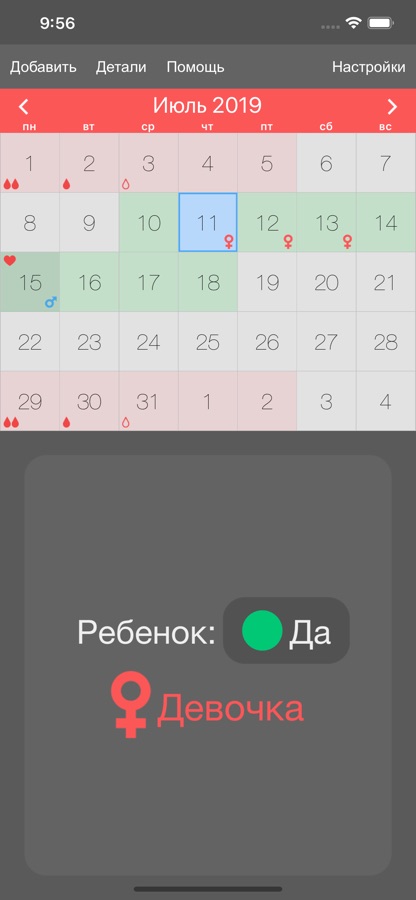 • Вероятность пола ребёнка для каждого фертильного дня.