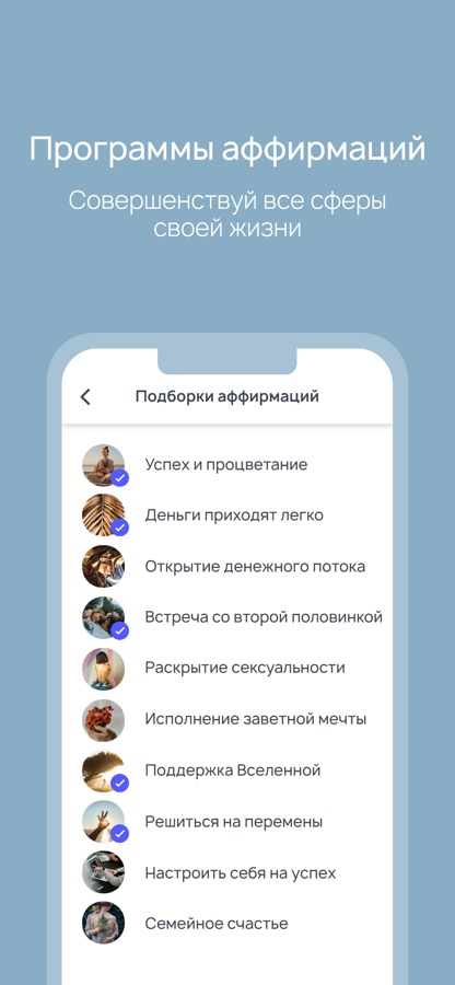 Для работы с аффирмациями в приложении есть специальный плеер, который позволит грамотно работать с позитивными установками. В нем ты сможешь проговаривать аффирмации или повторять их мысленно.