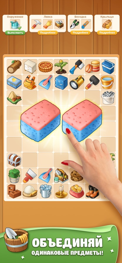 Объединяйте похожие предметы и получайте полезные инструменты для улучшения сада и дома Анны!