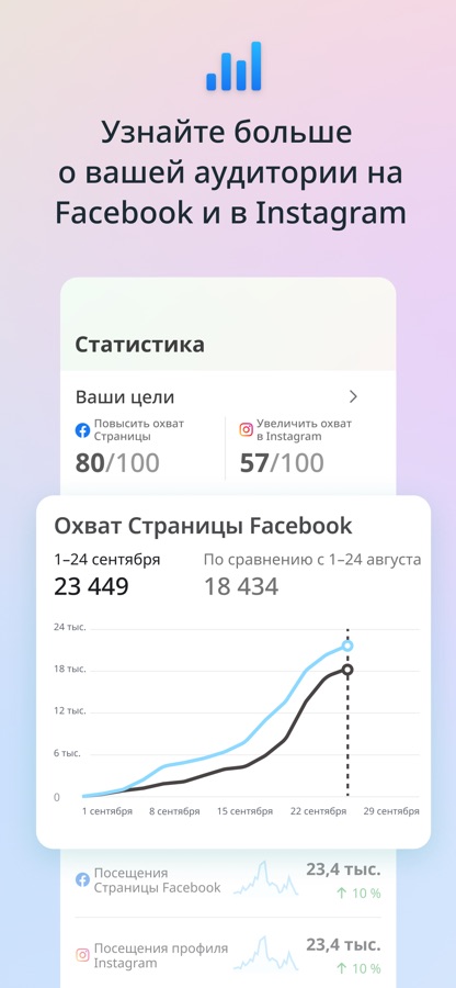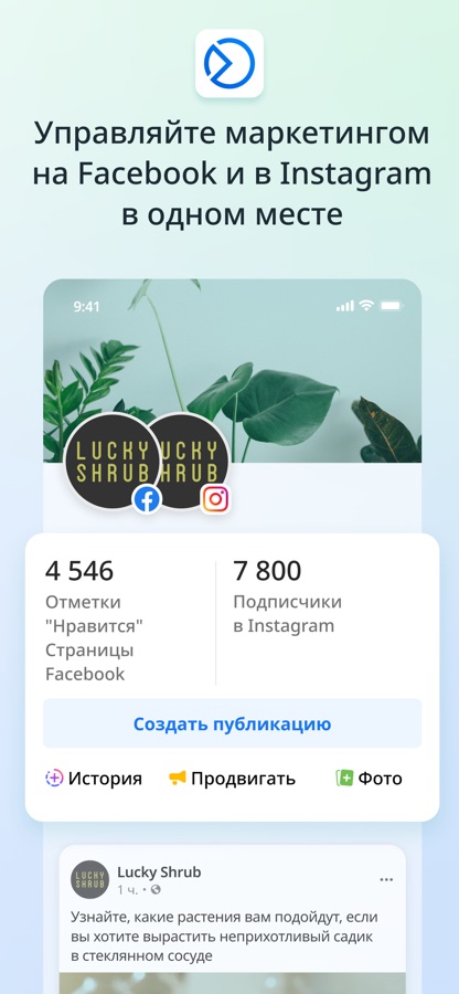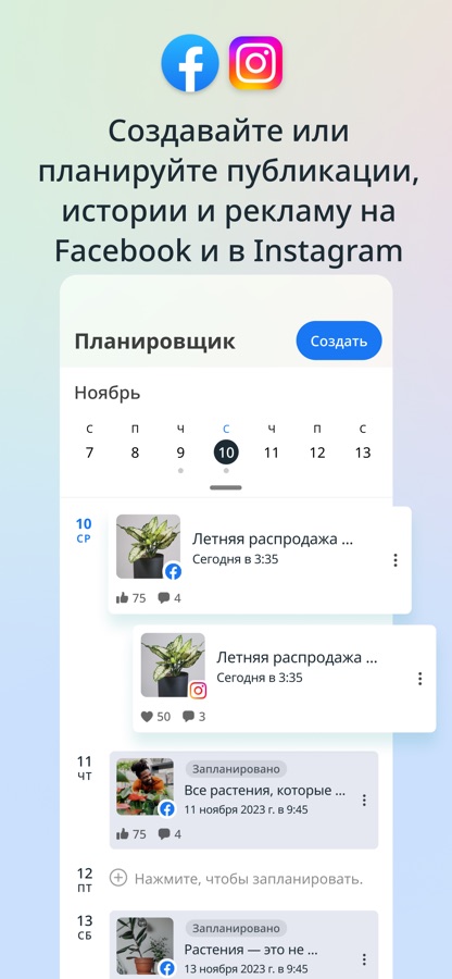 • Создавать и планировать публикации и истории для Страницы Facebook и аккаунта Instagram, а также управлять контентом.