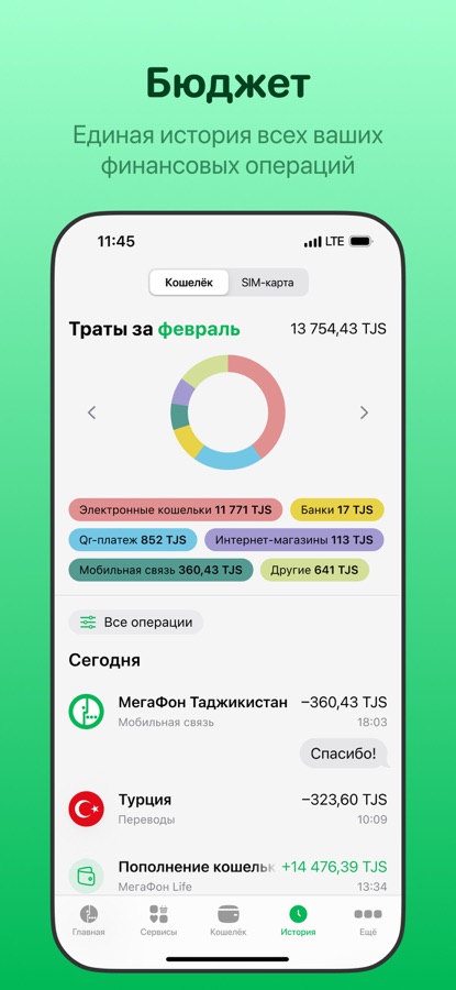 • Единая история всех финансовых операций с диаграммой и фильтром по категориям расходов.
