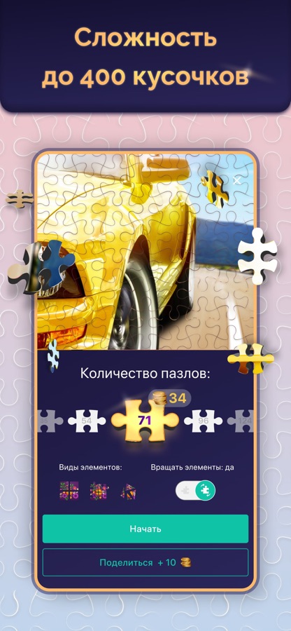 Вы можете тонко настроить сложность игры. Паззл может содержать до 300 элементов. Вы можете задавать форму и вращение кусочков картинки, создавая самые сложные пазлы — для взрослых игроков это будет серьезным испытанием. Но чем сложнее пазл, тем больше монет вы получите.