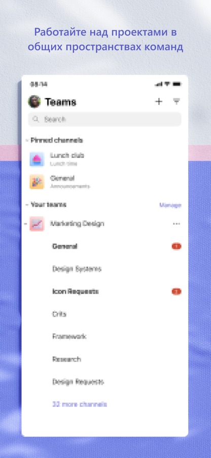 • Тесно взаимодействуйте, упорядочивая беседы по определенным темам и проектам с помощью команд и каналов.