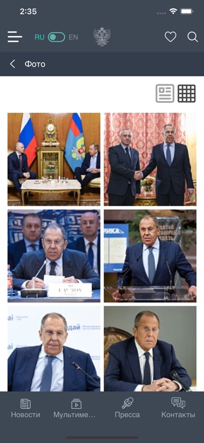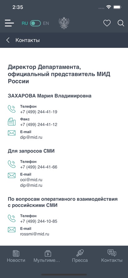 — просмотр новостной ленты и ключевых разделов официального портала МИД России на русском и английском языках;