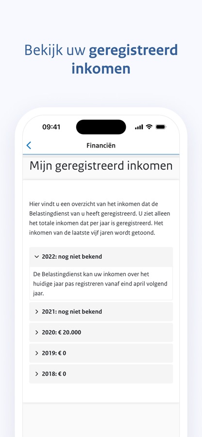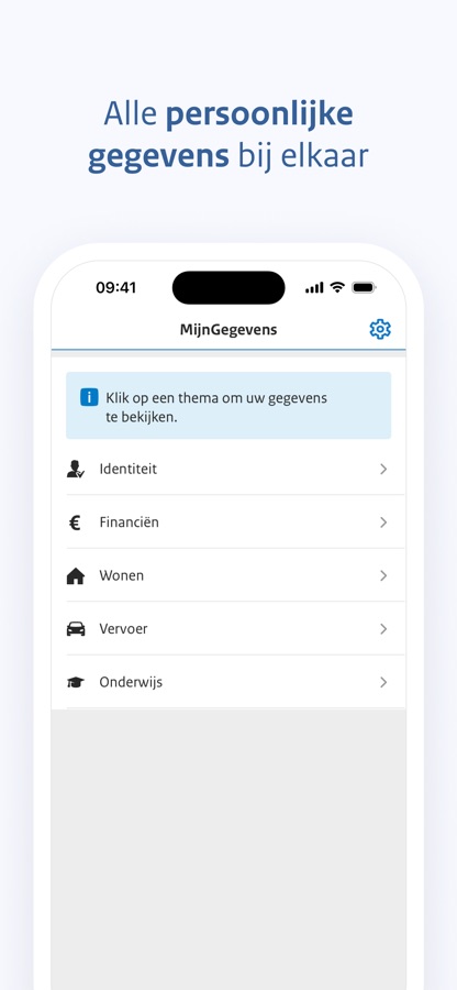 Snel uw energielabel opzoeken of uw inkomstengegevens controleren? Uw persoonlijke gegevens uit MijnOverheid staan nu handig en overzichtelijk in 1 app: de MijnGegevens app van MijnOverheid. Klopt er iets niet? In de app ziet u direct u hoe u uw gegevens kunt (laten) aanpassen. Belangrijke data zoals de verloopdatum van uw paspoort of identiteitsbewijs zet u via de app direct in uw eigen agenda.