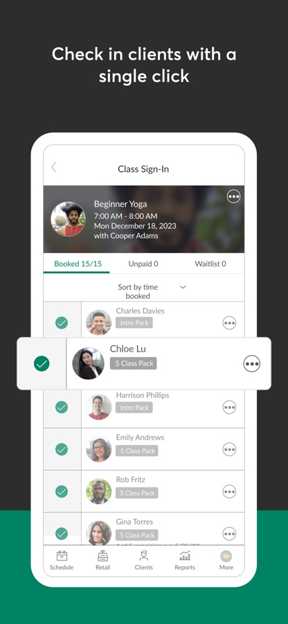 — Eliminate long lines at your front desk by checking clients in.
