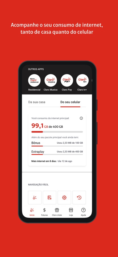 Cliente Móvel e Residencial, com o Aplicativo Minha Claro, você tem o controle total dos seus produtos (exceto corporativo). Gerencie seus planos de celular, internet banda larga e TV com agilidade e tenha acesso gratuito sem consumir sua internet.*