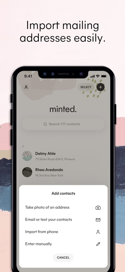 Login and sync with your Minted account and online address book, and get notified of the latest offers from Minted.