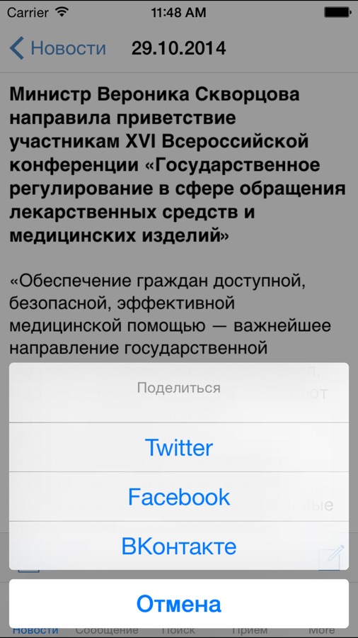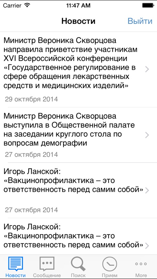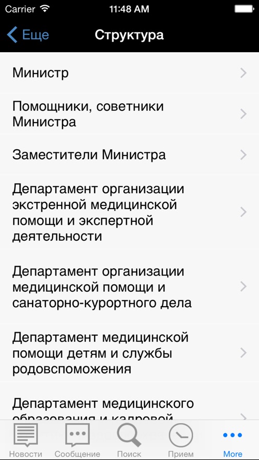 Мобильное приложение «Минздрав России» позволяет получать актуальные новости с сайта Министерства здравоохранения Российской Федерации, комментировать и делиться ими в соцсетях. С помощью данного приложения можно отправить обращение в Общественную приемную, просмотреть структуру Министерства, контактную информацию, ознакомиться с графиком личного приема граждан заместителями Министра и руководителями департаментов Министерства здравоохранения Российской Федерации и др.