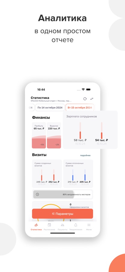 • Просмотр и формирование отчетности. Анализируйте работу вашей медицинской организации с помощью расширенных инструментов отчетности. Узнайте количество визитов, популярные услуги и загруженность врачей. Отслеживайте доходы, расходы и финансовые показатели вашей организации.