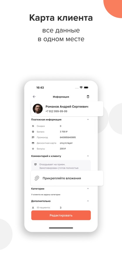 • Ведение базы пациентов. Создавайте и управляйте подробными картами пациентов. Вся информация о диагнозах, лечении и обследованиях доступна в одно касание. Сохраняйте адреса, номера телефонов и электронные почты для удобной связи, отслеживайте все визиты, консультации и коммуникации с пациентами. Добавляйте индивидуальные заметки и предпочтения для каждого пациента, выставляйте теги.