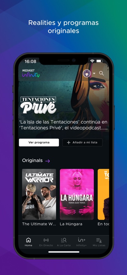 Mediaset Infinity es la app oficial de Mediaset España para ver la televisión, series y programas favoritos en directo y a la carta. Aquí puedes ver la TV online de tus canales favoritos y los mejores momentos en streaming de La isla de las Tentaciones, Supervivientes, Gran Hermano o La que se avecina, donde y cuando quieras.
