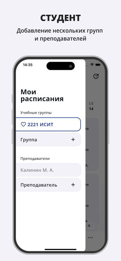 — Расписание занятий: просмотр расписания учебных групп и преподавателей с возможностью сохранить несколько групп и преподавателей.