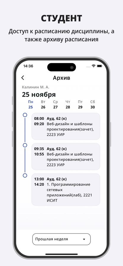 — Архив расписания: доступ к предыдущим расписаниям групп и преподавателей.