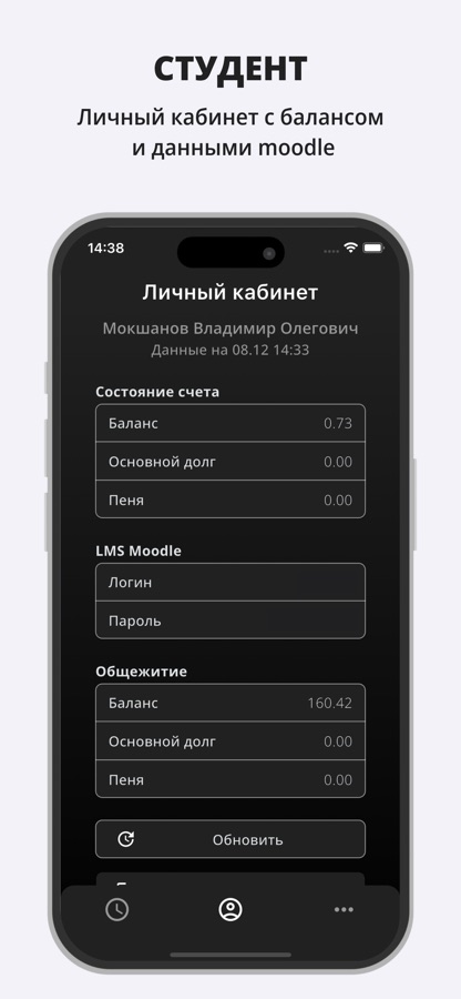 — Личный кабинет: доступ к балансу, данным LMS, а также балансу общежития.