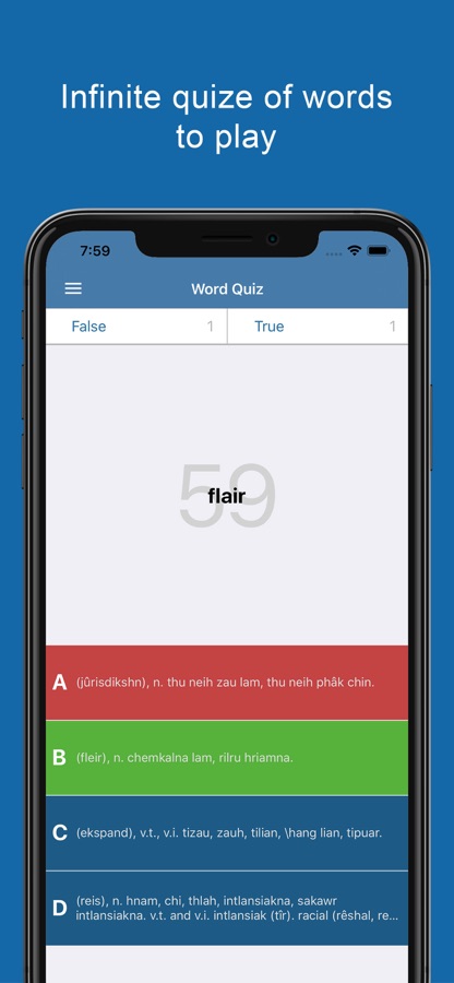 — We developed a new quiz inside Mizo dictionary! To take the quiz, you can easily tap the option icon in the top left side of the screen and choose quiz. Now, you will see a word in the screen with 4 answers, you will have to tap the answer that you think its right to see if it’s the good choice or not.